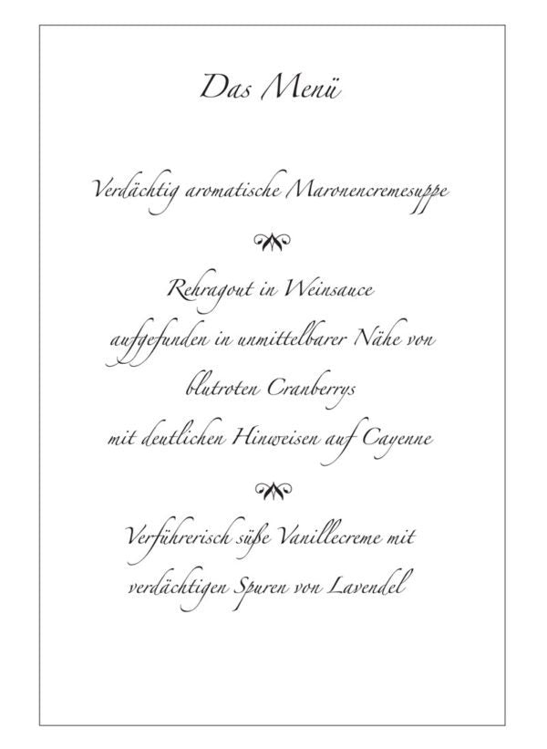 Die Mörderische Dinnerparty enthält einen Menüvorschlag mit den dazu passenden Rezepten.